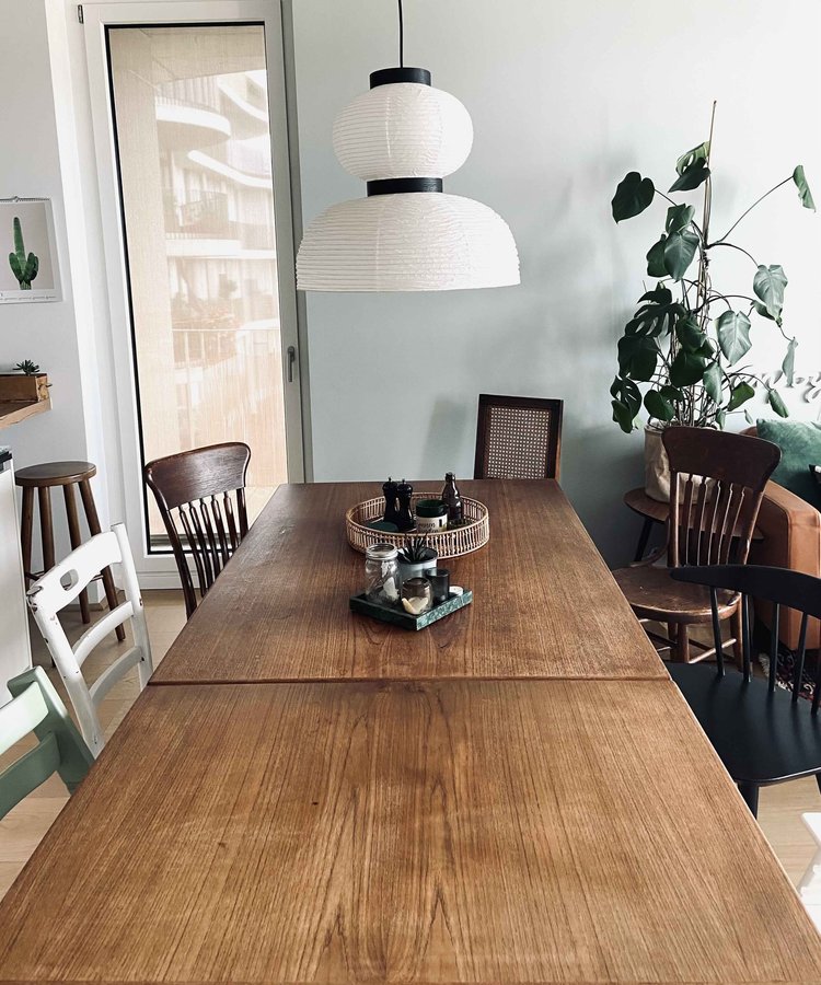 Ein großer Esstisch ist uns wichtig - er ist der Mittelpunkt unserer Wohnung. Hier wird gegessen, gemalt, gebastelt, viel geredet und auch mal ein Glas Wein getrunken ☺️ Der Tisch hat schon viele Spuren...Von Kratzer bis Filzstift. Von Zeit zu Zeit schleife ich mal drüber aber eigentlich mag ich es so.