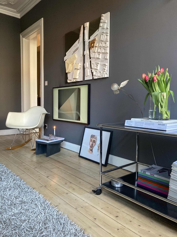 Wohnzimmer, Holzdielen, USM Haller, Servierwagen, TV, The Frame, Bilder, Schwarz, Vitra, Schaukelstuhl