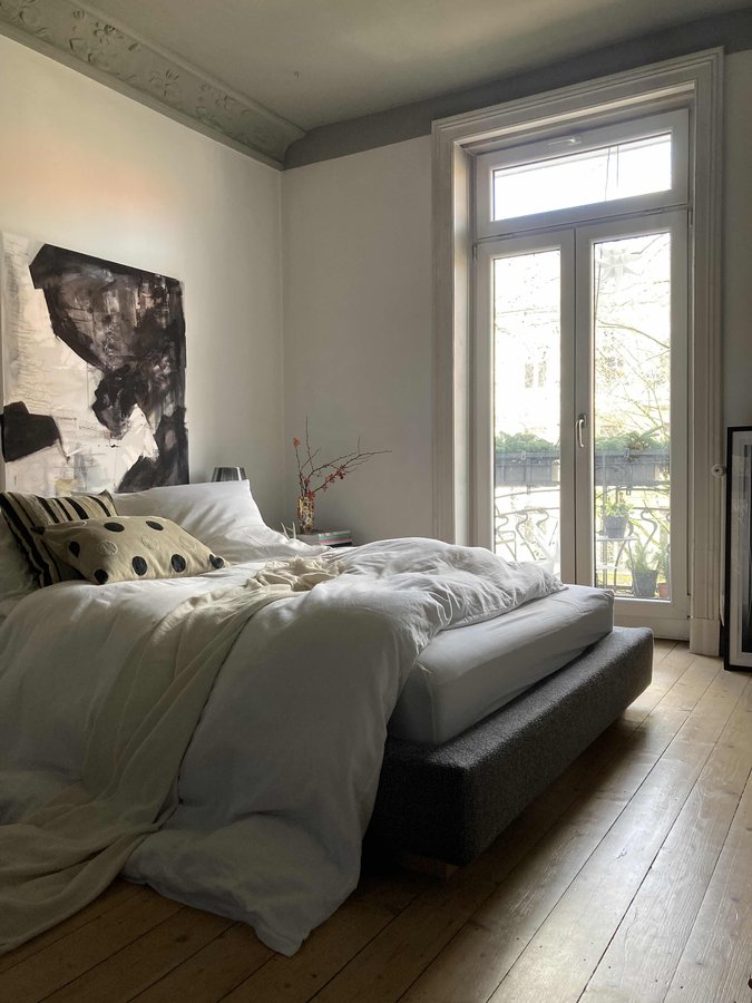 Schlafzimmer, Holzdielen, Altbau, Stuck, Bett, Gemütlichkeit
