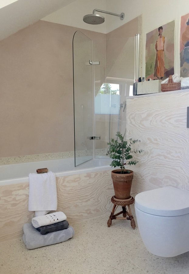 Beton Ciré, Terrazzo, Eukalyptus, Regendusche, masterbad