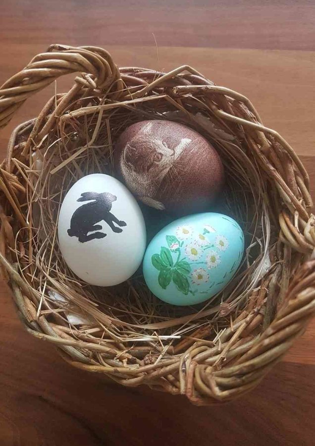 Diese drei Eier stehen jedes Jahr zur Osterzeit auf meinem Tisch. Eines der Eier wurde von meiner Mama gefärbt und bemalt, eines wurde von mir bemalt und das Dritte wurde von meiner Tante gefärbt und gekratzt.