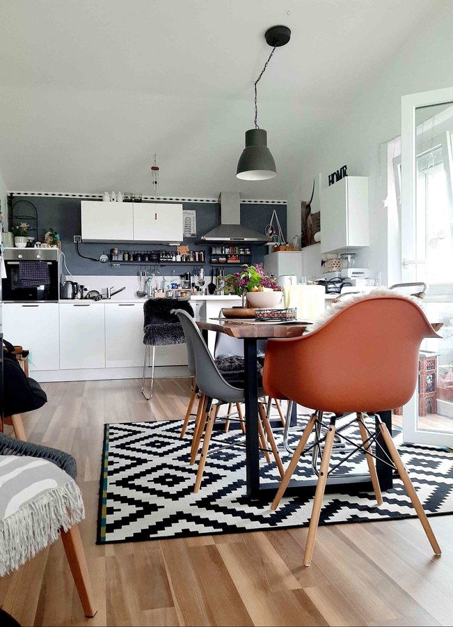 Wohnraum, Sofablick, Esstisch, Ikea, Holztisch, Stuhlmix, Küche, Black, White, Wood