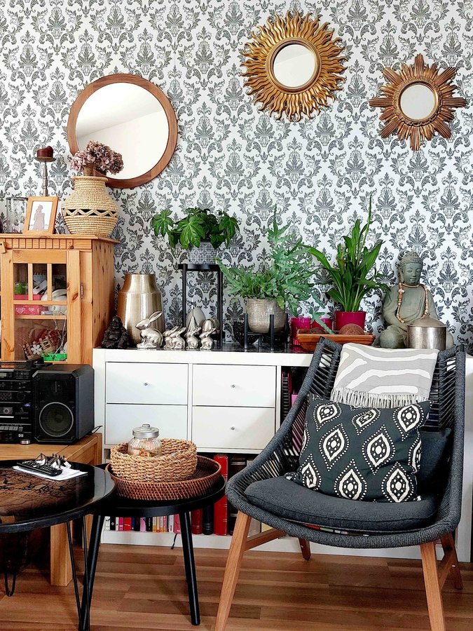 Umgestaltung, Holzvitrine, Sidebord Ikea, Stuhl Jysk, Beistelltische, Körbe, Tapete, Vintage, Pflanzen, Holz