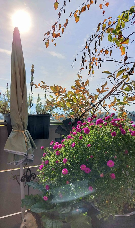 Balkon, astern, Sonnenschirm, birke, Herbstfarben