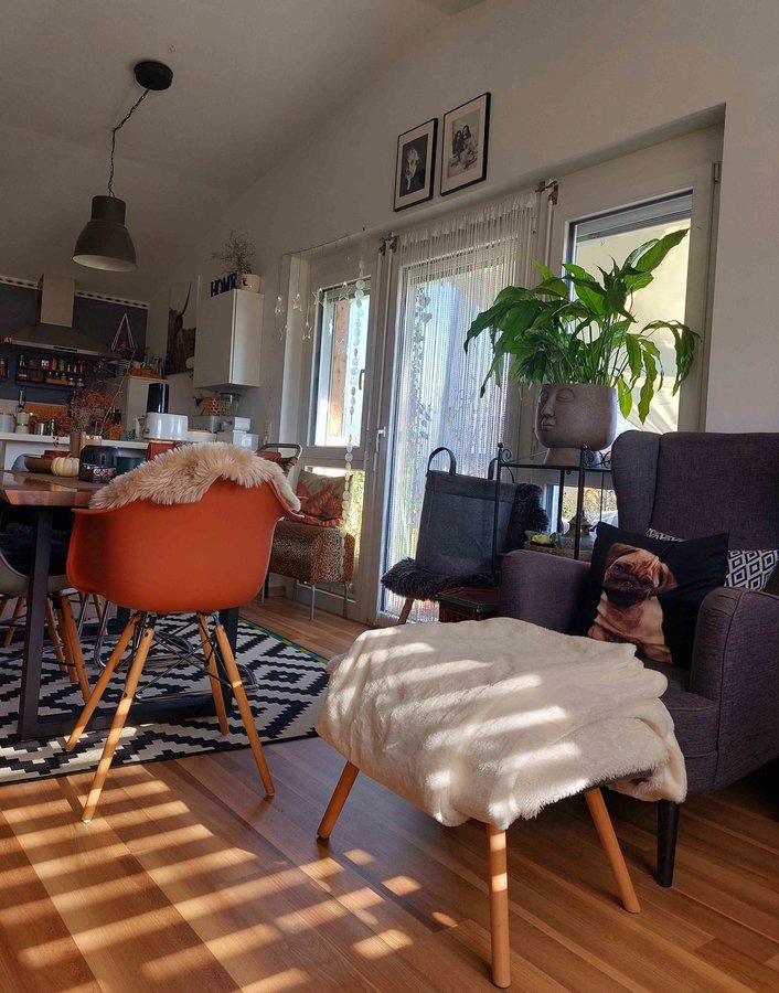 Wohnraum, Felle, Teppich ikea, Esstisch, Stuhlmix, Pflanztopf, Balkonblick, sonnentag
