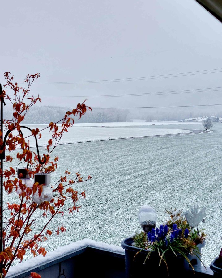 Balkon, Ausblick, Aprilwetter, Ahorn, Schnee, Muskari