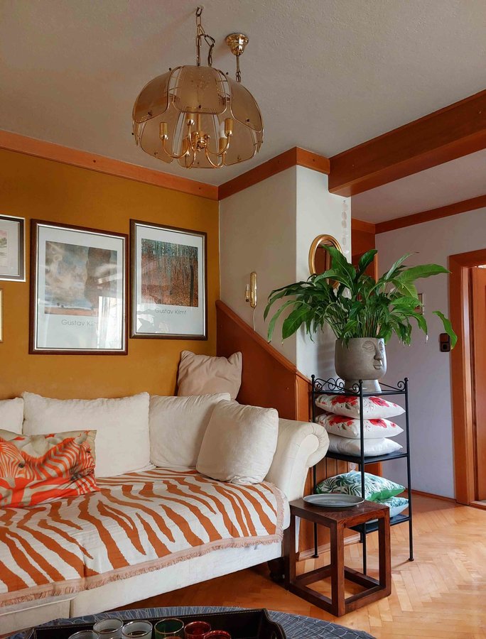 Wohnzimmer, Obere Wohnung, Altbau, Parkett, Holz, Sofa, Decke HmHome, Zebra, Pflanztopf, Bilderwand