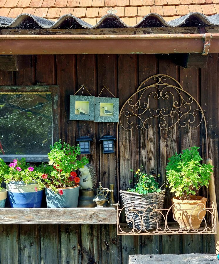 Herbst, Garten, Garage, Blumenregal, Altholz, Gartenimpressionen, Auenland