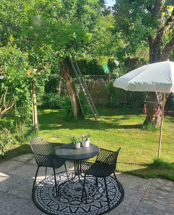 Gartenliebe, Obstbäume, Sonnenschirm, Outdoorteppich, Sitzplatz, blackandwhite, Mandala, Auenland