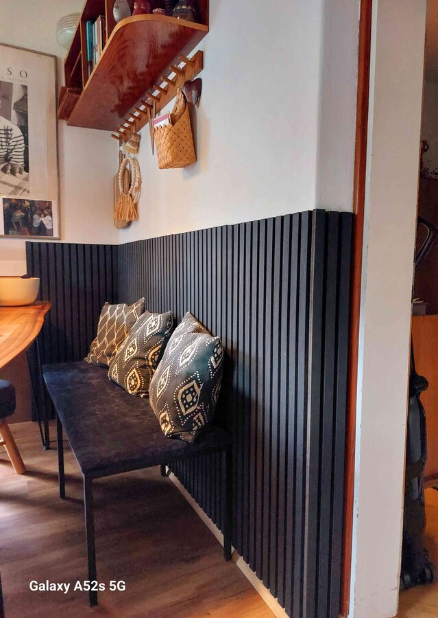Essecke, Wohnküche, Altbau, Akustikpaneele, Kissen, Holzregal Vintage, Hakenleiste