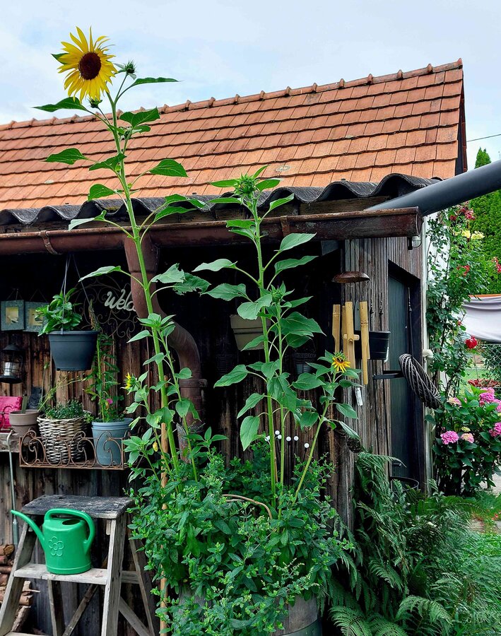 Holzgarage, Holzfass, Garten, Sonnenblumen, Farn, Hirtensien, Auenland