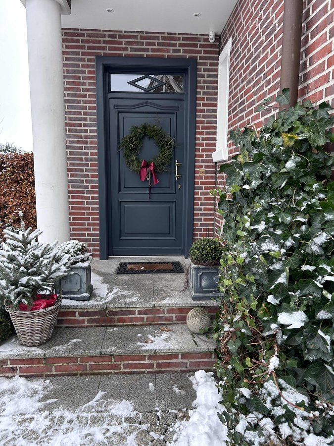 Hier nochmal ein Bild von unserem Eingang . Unsere Haustür war eigentlich immer grün , wir haben sie letztes Jahr grau gestrichen und ich finde mit den Türkranz wirkt das Grau richtig schön .