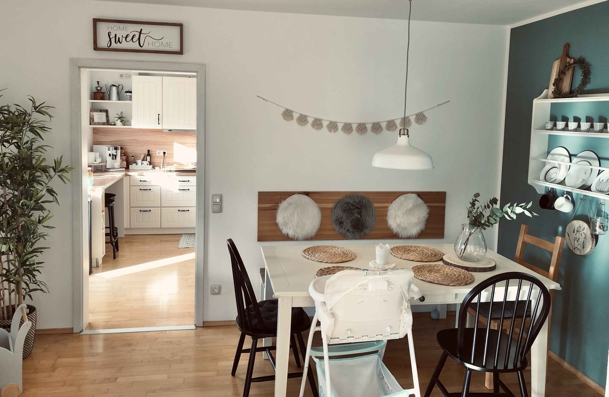 unser Essbereich mit neuer Lampe und Makramee Girlande ☺️