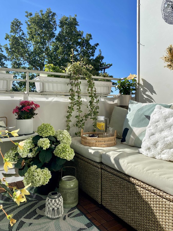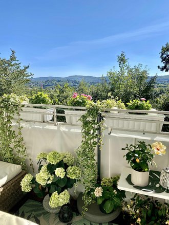 Der Balkon ist mein absolutes Lieblingseck im Sommer. Hier kann man wunderbar auf der Lounge entspannen und rumlümmeln, über Mittag unter dem Sonnenschirm.