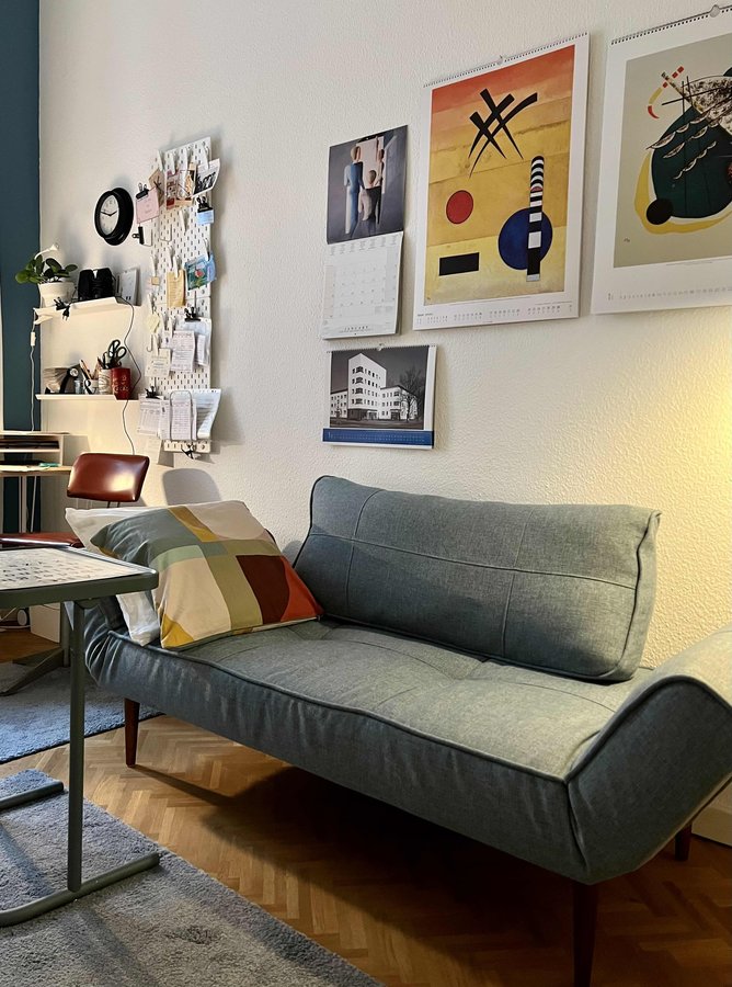 Frisch eingezogen ins Arbeitszimmer ist das kleine Bettsofa. Es ist ideal zum gemütlichen Podcast-Hören, für einen Schlafgast oder zum Lümmeln beim Recherchieren.