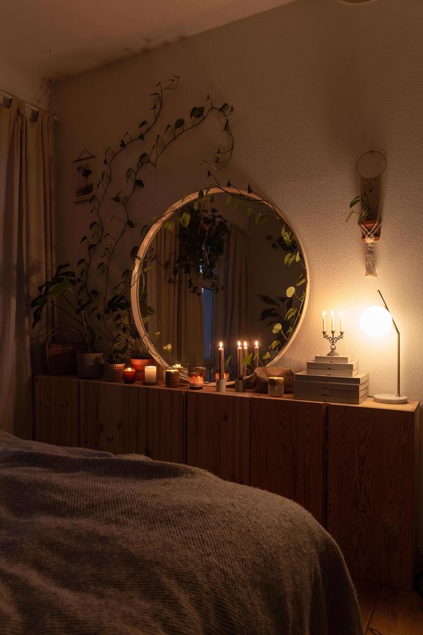 Schlafzimmer, Spiegel, Runder Spiegel, Ivar, Ikea, Gemütlich, Gemütlichkeit, licht, Urban Jungle, Pflanzen, Kerzenlicht