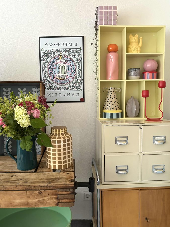 Wohnzimmer, Werkbank, Wasserturm, Poster, Vase, Blumen, Blumendeko