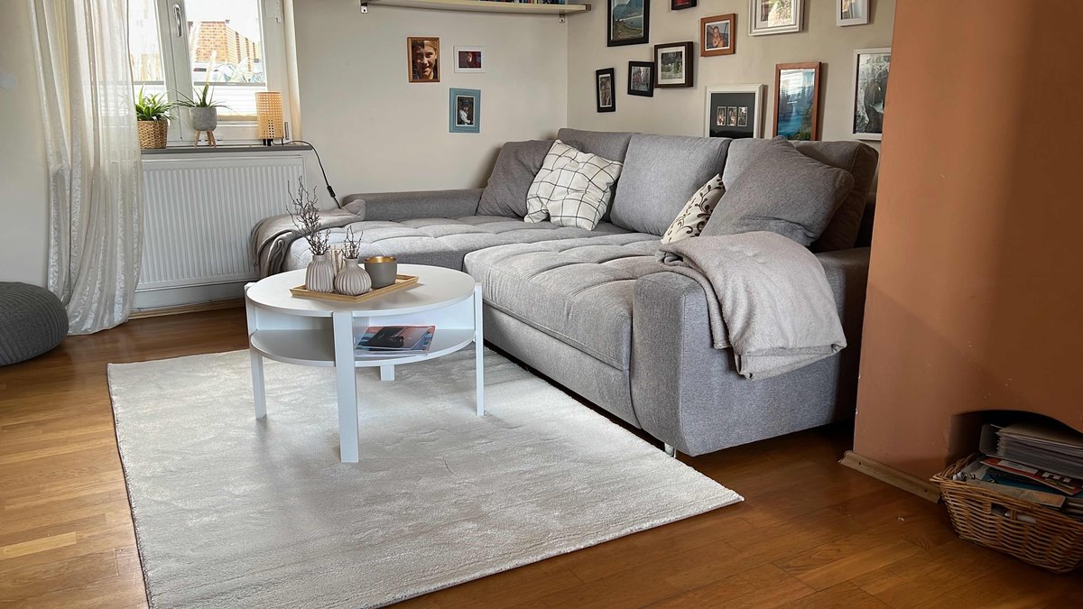 Unser kleines Wohnzimmer mit gemütlicher Couch. Mittlerweile sind noch mehr Kissen eingezogen.