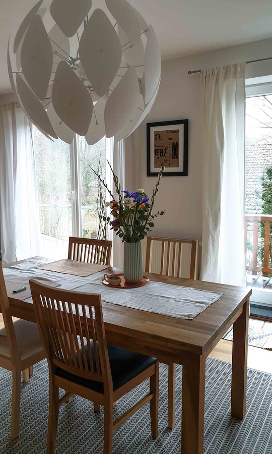 Unsere Essecke im Wohnzimmer. Von hier aus beobachten wir gerne die Vögel, die sich draußen auf unserem Balkon tummeln.