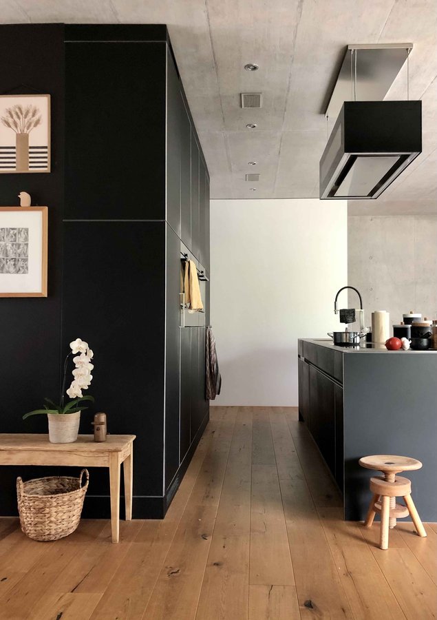 Eichenparkett, Sichtbeton, Schwarze Küche