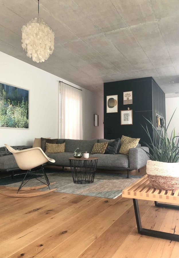 Betondecke und Eichenparkett, diese Kombination zieht sich durchs ganze Haus (inkl. Bäder). Passt für mich einfach gut zusammen 🤍🤎