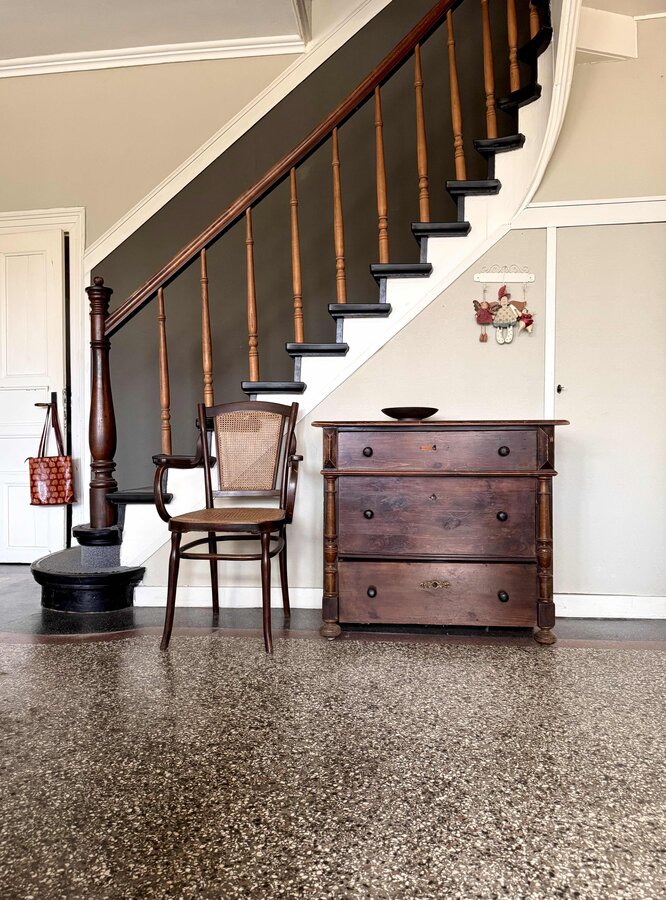 Diele, Eingangsflur, Treppenhaus, Terrazzoboden, Vintage, Kommode, Wiener Geflecht