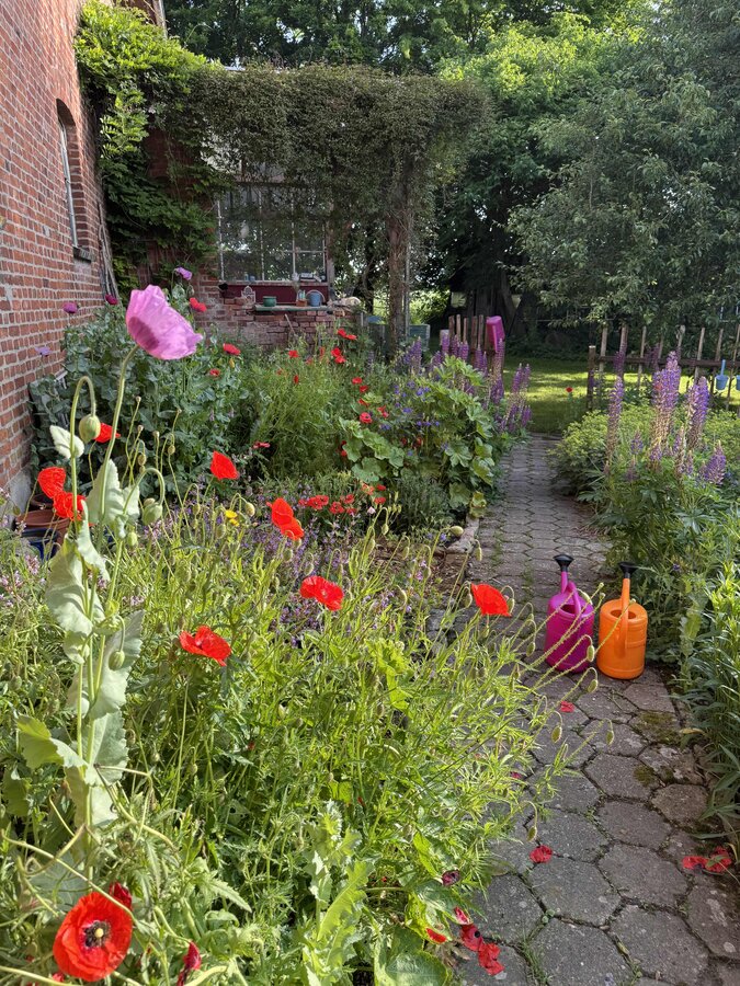 Garten, Sitzplatz, Backstein, Mohn, Lupinen, Kannen, Staketenzaun