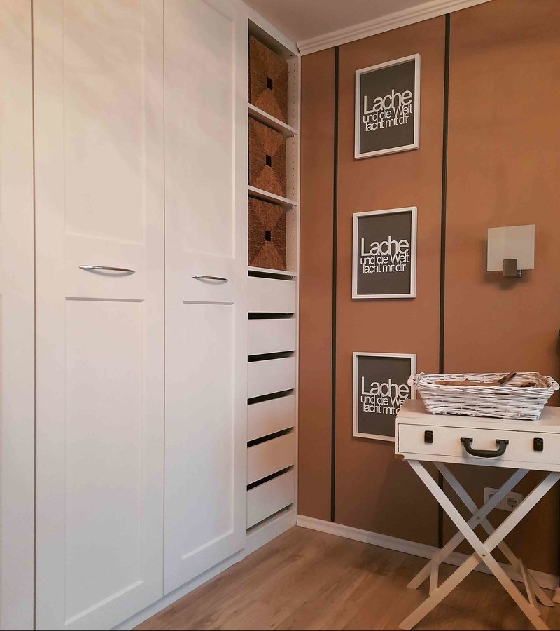 Bei uns hat der Platz nicht mehr gereicht für ein Schrankteil mit Tür, da haben wir ein Regal mit Kästen eingesetzt um dem Platz optimal auszunutzen. War viel Arbeit, mein Mann musste jedes Brett und jeden Kasten in der Breite kürzen und wieder zusammen bauen.🙈🙊