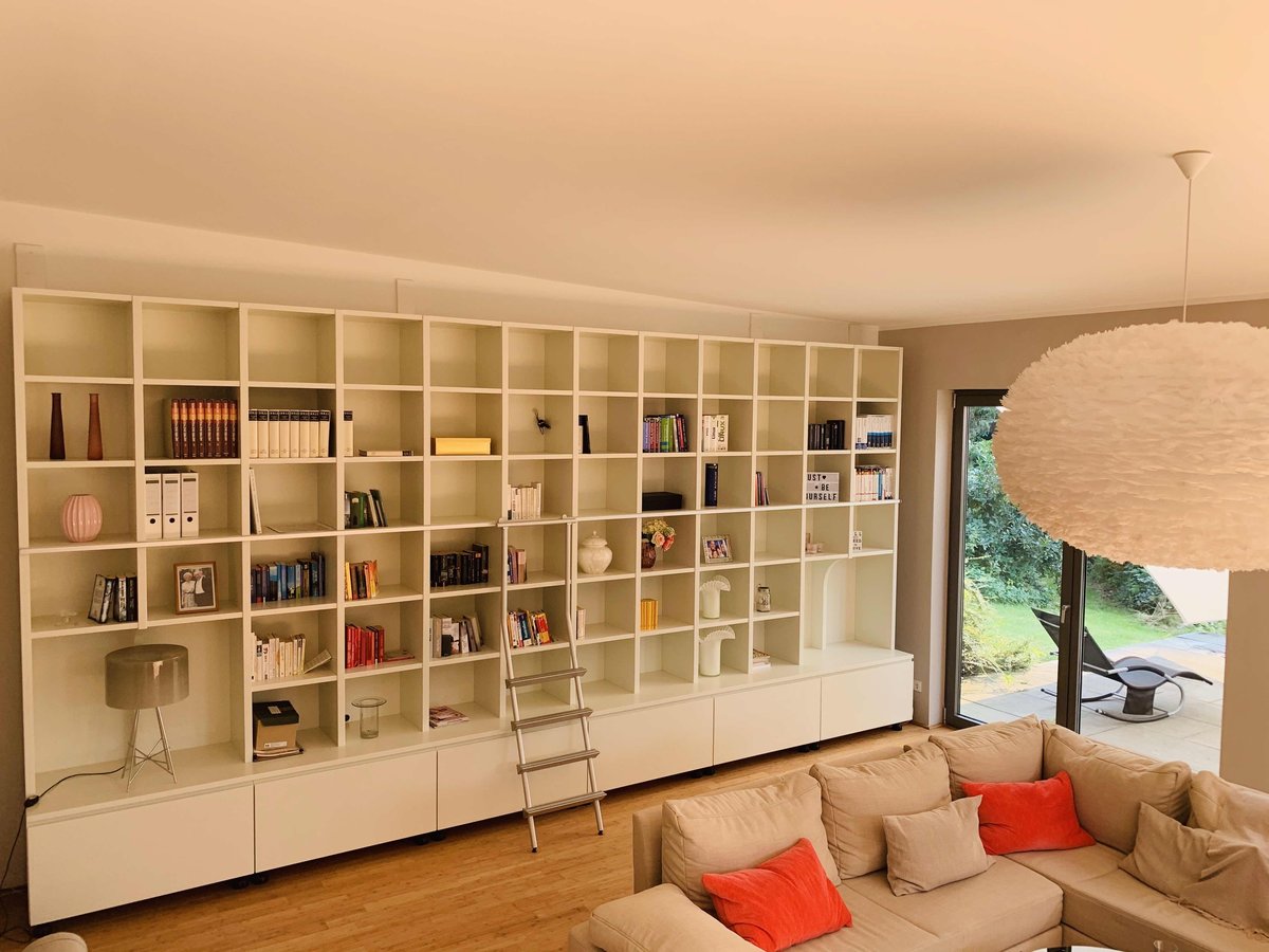 Weil Ihr danach fragtet.... unser Regal im Wohnzimmer. Der Vorbesitzer des Hauses hat es auf Maß fertigen lassen. Es bietet super viel Stauraum besonders mit den großen Schubladen unten...