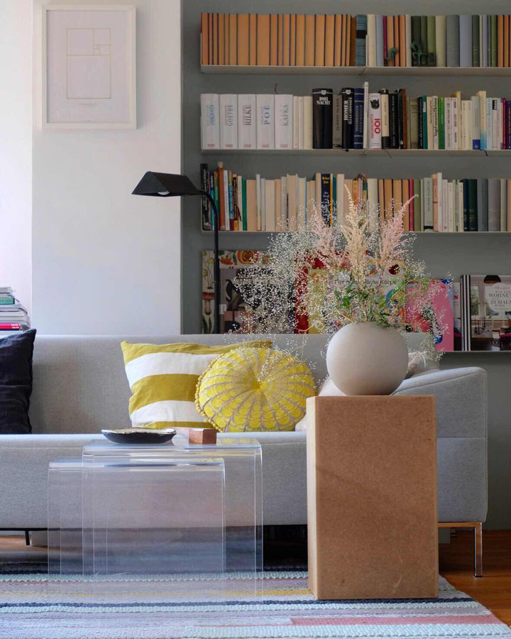 Wohnzimmer, Spätsommer, Vintage Tische, freistil sofa, Rolf Benz, ikea teppich, Bücherwand, Bücherregal