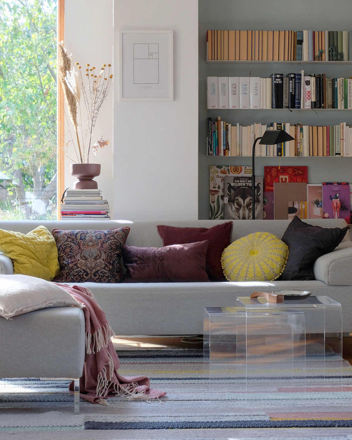 Herbstfarben, Aubergine, Gelb, Sofaecke, Couch, Freistil, Bücherregal, Herbst