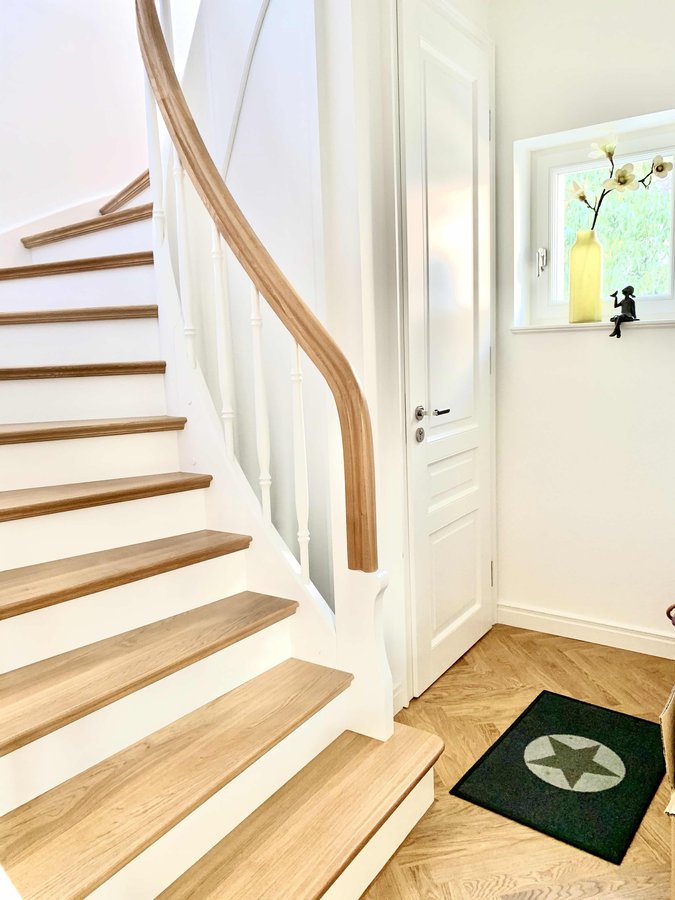 Hallo Ihr Lieben. Hier unsere Treppe, über die wir uns viel Gedanken gemacht haben. Darunter ist die alte Terrazzotreppe versteckt. Jedes Detail wurde bemustert und besonders beim Handlauf wollten wir einen besonderen Verlauf bis in die dritte Etage. Die weiße Wand im Hintergrund soll noch eine Tapete mit Urwaldmusterung erhalten. In diesem Sinne, aufwärts in den Tag 😉