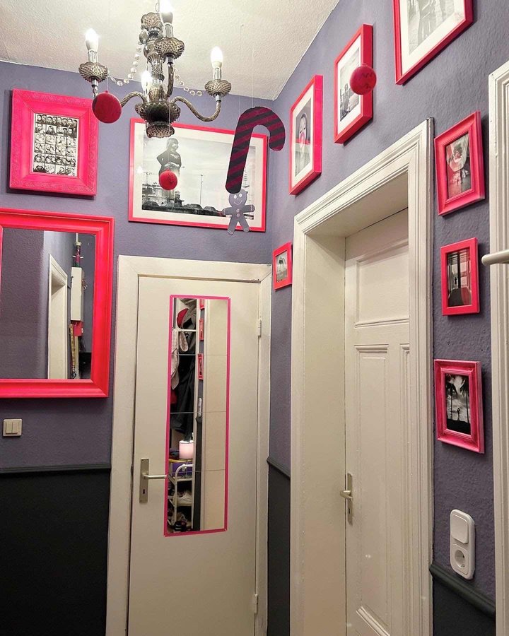 Aus dem vorher weißen Flur habe ich mit Styroporzierleisten und den Farben Lila & Grau in Verbindung mit neonrosanen Bilderrahmen einen „funky Flur“ gezaubert. Die Idee kam mir aufgrund eines Graffitis in unserem Hauseingang 😉