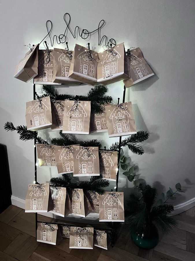 Der diesjährige Adventskalender mit Lichterkette und Tanne weihnachtlich gestaltet!
