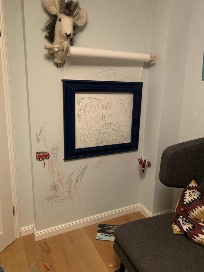 Die schlaue Konstruktion des Mannes hat die kleine Dame leider nicht davon abgehalten auch die Wand anzumalen... immerhin, jetzt versteht sie das Prinzip, aber die Buntstiftspuren sind nicht so leicht zu tilgen.