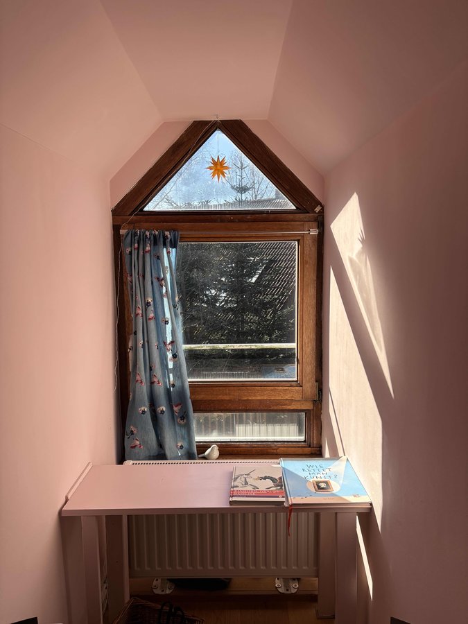Die kleine Gaube im Dachgeschoss hat einen rosa Anstrich und einen Mini-Einbautisch bekommen. Man sieht, dass die Dämmung beim letzten Umbau dicker wurde. Ich mag so unperfekte Ecken.