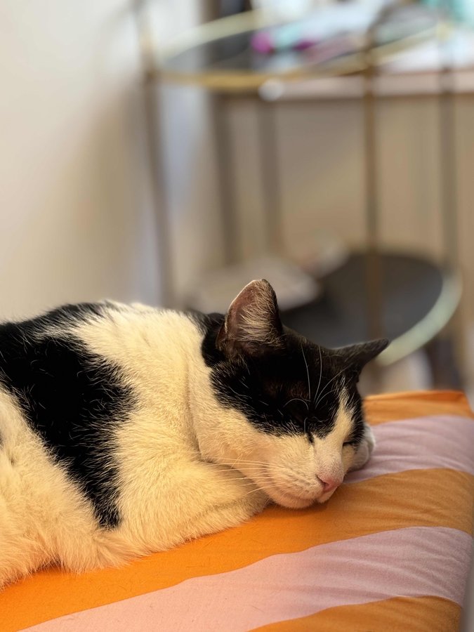 Der haarige Sitzmöbeltester ist zufrieden.