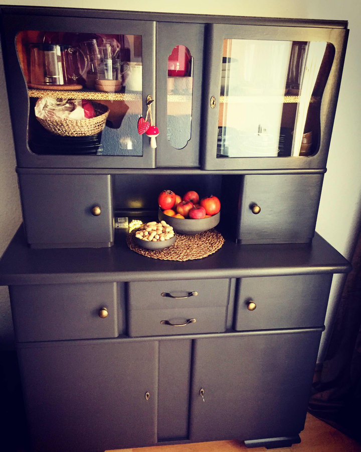 Küchenbuffet, Küche aktuell, Umgestaltung, Anthrazit, DIY Bild, Aus alt mach neu, Möbelgriffe, Obst, Geschirr
