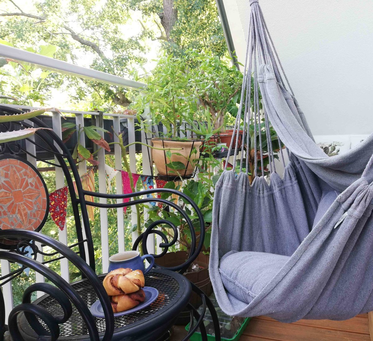 Nach der Gartenarbeit heute habe ich mir eine Pause gegönnt. Der schmale Balkon ist wie schon das Beet wild bepflanzt. Ich mag das so.