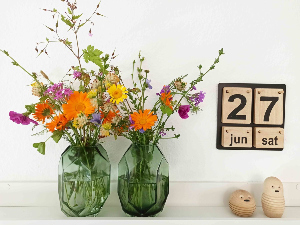 Vasensammlung, Vasen, Blümchen, Blumen, Wiesenblumen, Kalender, Vogel