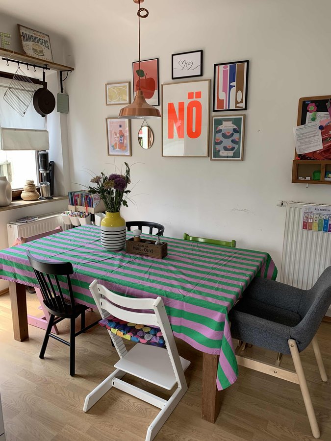 FotoFrage, Essbereich, Esstisch, Streifen, Vasenliebe, Ikea, Tischdecke, HM Home, Bilderwand, Frische Blumen, Ikea Hack, Küche, Alt und neu, Altbauliebe