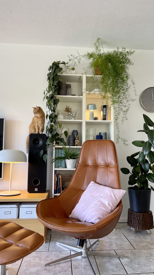 Leseecke, Katze auf Box, Hängepflanze, falscher Spargel, Gummibaum, FotoFrage