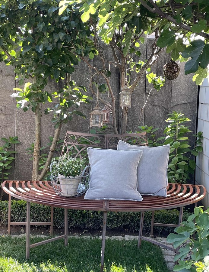 Rostrundbank, Kissen, Laternen, Diamond Frost, Risphortensien, Obstspalier, Feigenbaum, Buchs