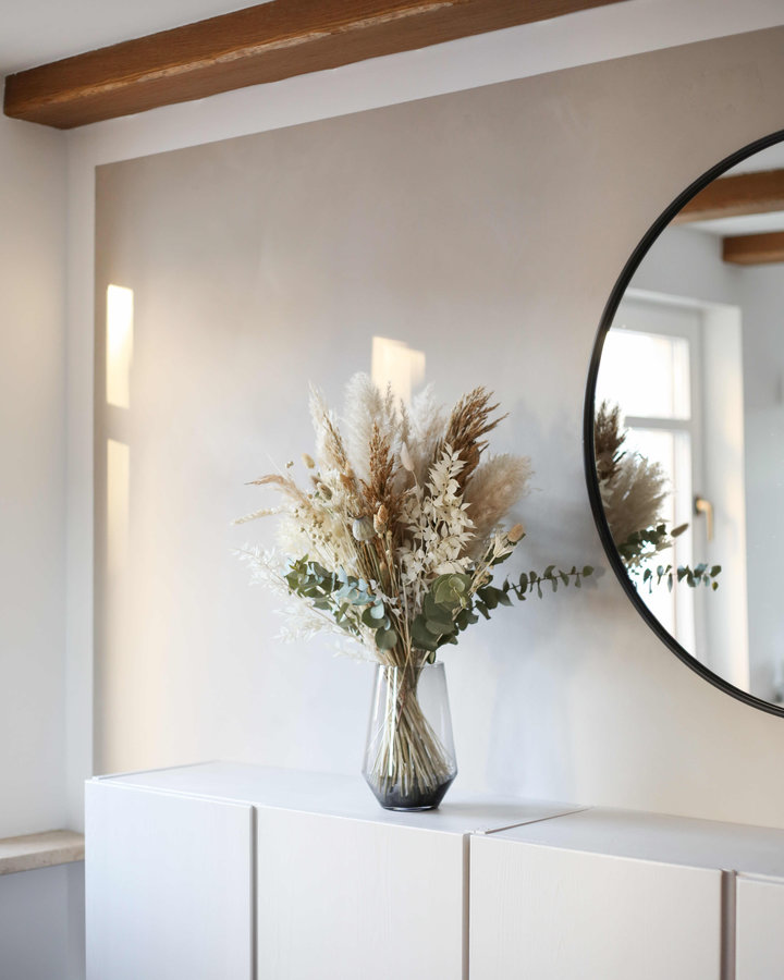 Trockenblumen, Trockenblumenstrauß, Wohnzimmer, Deko, Blumenstrauß, Ivar, kalklitir, Stauraum, Runder Spiegel, Beige, Schwarz, Altvau, kleines Haus, Esszimmer, Vase