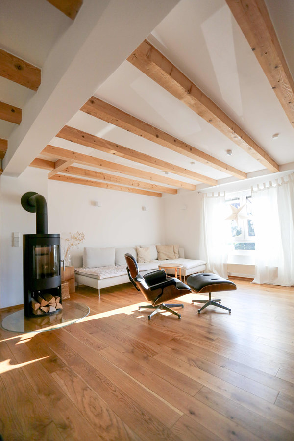 Wohnzimmer, Livingroom, Eames Lounge Chair, Söderhamn, Kamin, Holzbalken, Altes Haus, Hausrenovierung, kleines Haus, Eichendielen, Winter, Weihnachtszeit, Weißes Wohnzimmer, Weißes sofa, weiß und holz, Holz