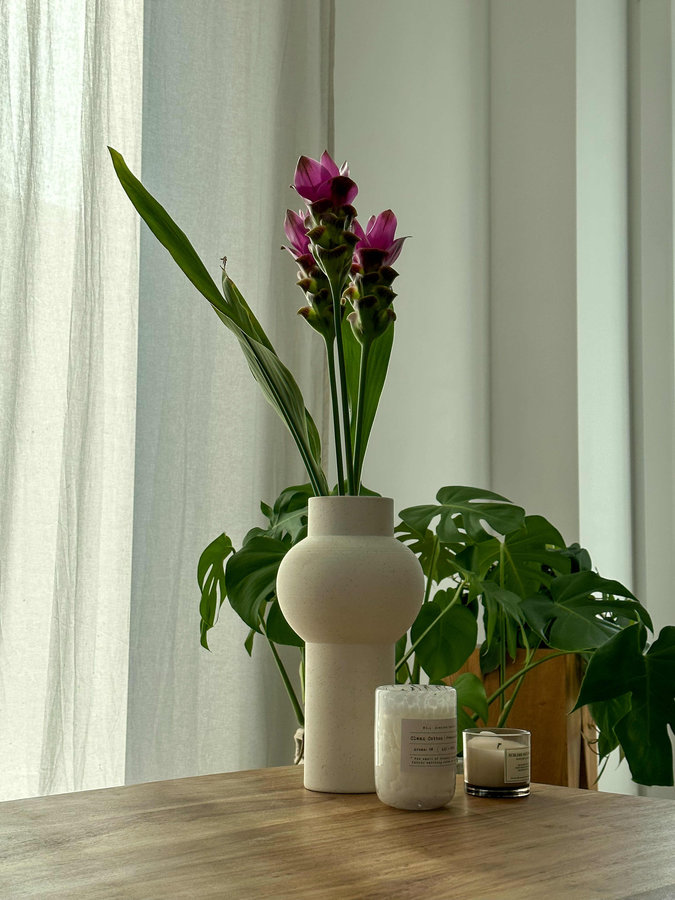Couchtisch, Blumendeko, Vase, Hk living, Frische Blumen, Pink, Weiß, Duftkerzen, Pflanzen, Holzhocker