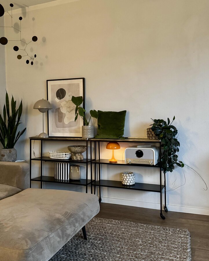 Seit Tagen konfiguriere und denke ich hin und her, ob ich die beiden Regale nicht durch ein USM-Sideboard ersetze, aufgelockert mit zwei Klapptüren und zwei offenen Fächern mit Rückwand, Farbe beige oder olivgrün, Maße fast identisch. Etwas mehr Stauraum wäre fein. Aber so luftig ist es dann nicht mehr. Ich schlaf nochmal drüber 😵💫