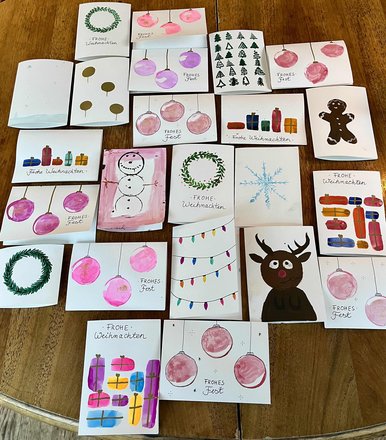 Gestern habe ich mit meinen zwei Töchtern Weihnachtskarten gebastelt, also besser gesagt gemalt. Wir hatten große Freude dabei. Leider waren wir ein bisschen spät dran. Ich hoffe, die Karten kommen noch vor dem Fest an. ⭐️