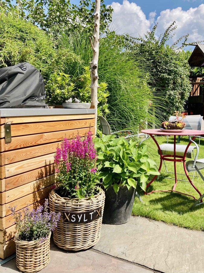 August, 2021, Garten, Terasse, Pflanzen, Körbe
