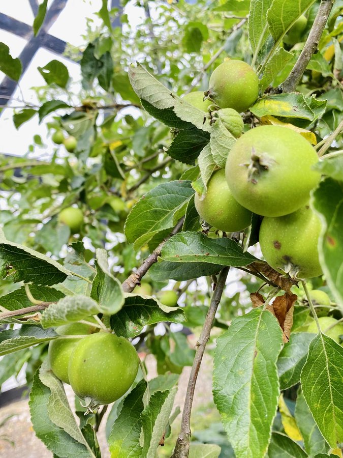 Der Apfelbaum trägt in diesem Jahr überschwänglich viele Äpfel, zum Essen, für Saft, leckeren Apfelkuchen….! Das wird ein Fest! 😀